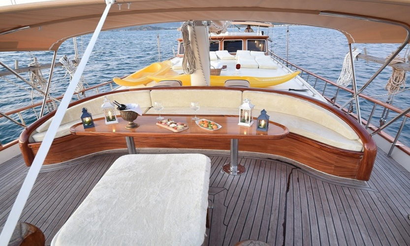 Tik ağacı kaplı güvertede arka kısımda oturma grubu ve yemek masası, ön kısımda ise güneşlenme minderleri ve oturma alanı yer alır. Deniz merdiveni ve güverte duşu sayesinde deniz keyfi rahatlıkla yaşanabilir.