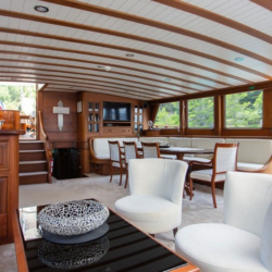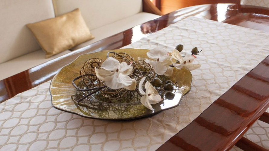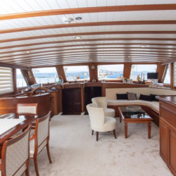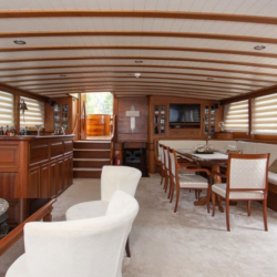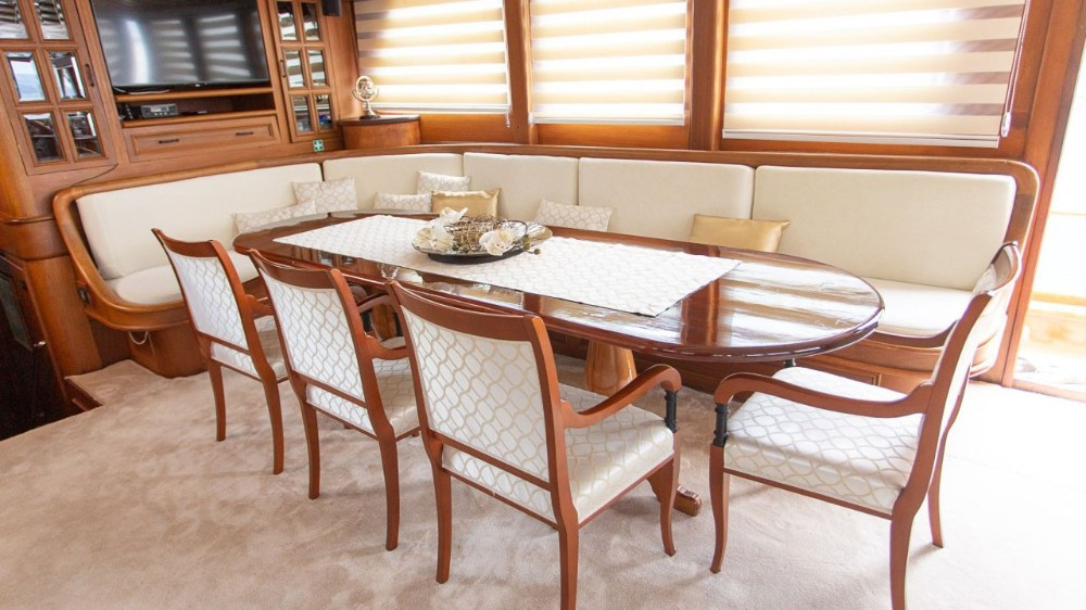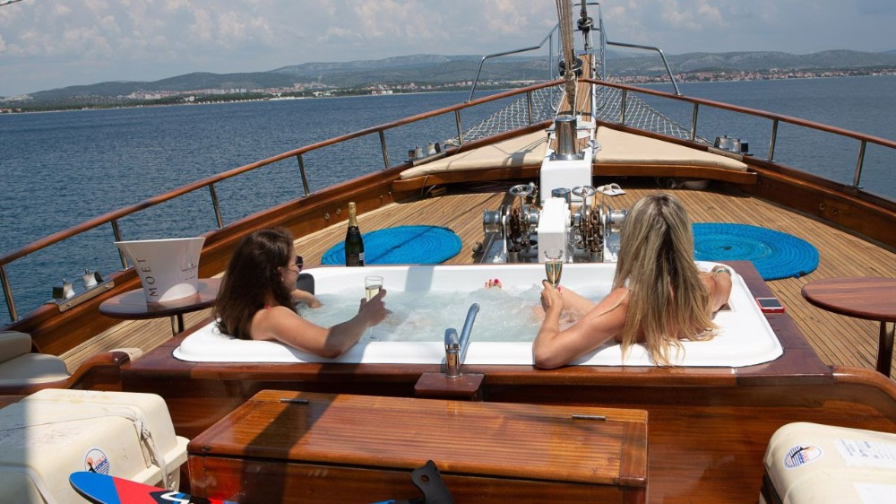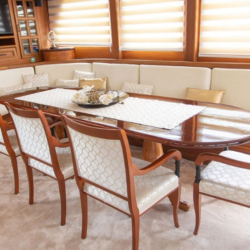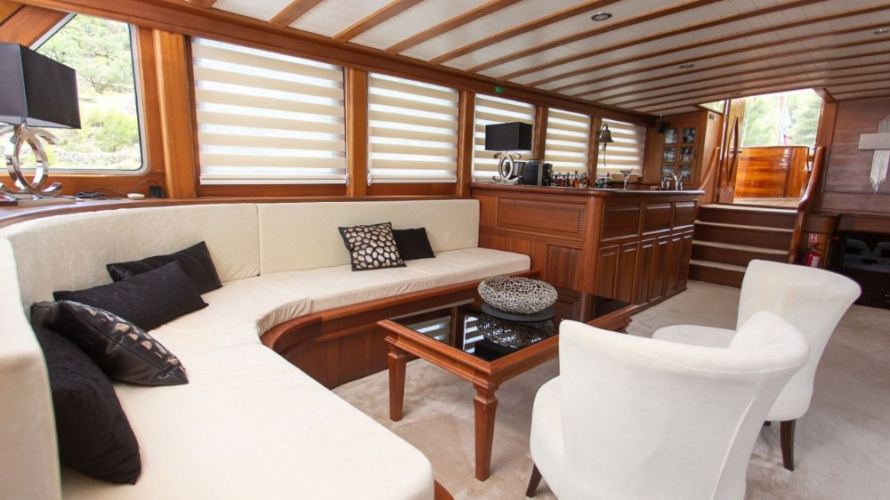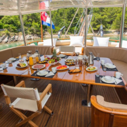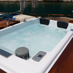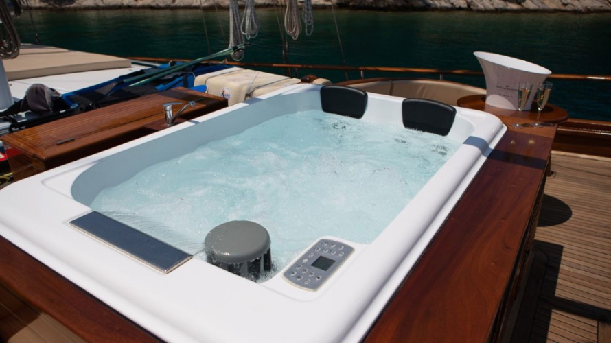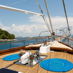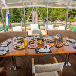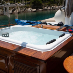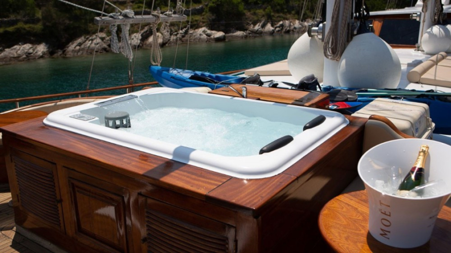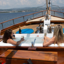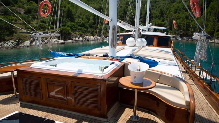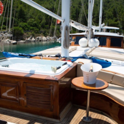Güverte: Tik ağacı zemin, arka ve ön güvertede oturma ve yemek alanları, güneşlenme minderleri, jakuzi, deniz merdiveni ve güverte duşu.