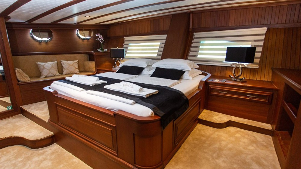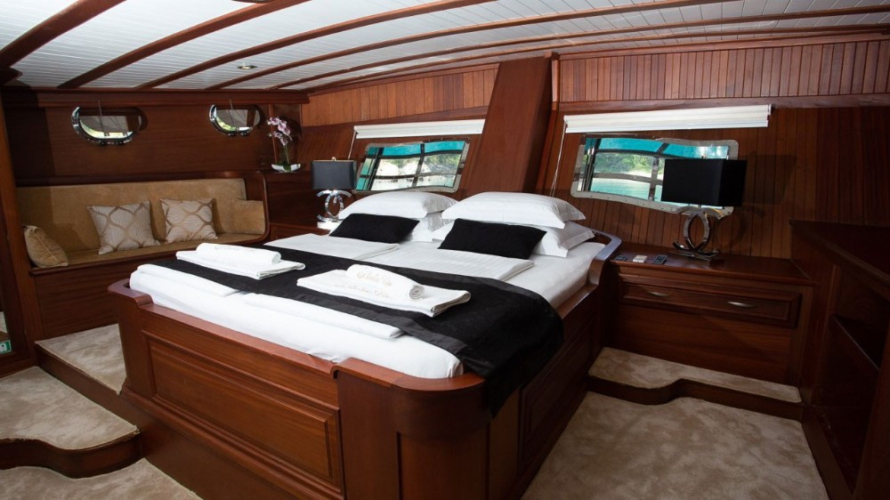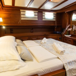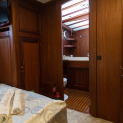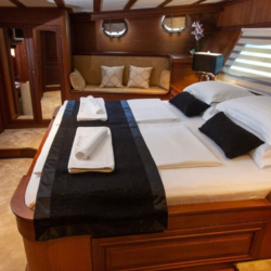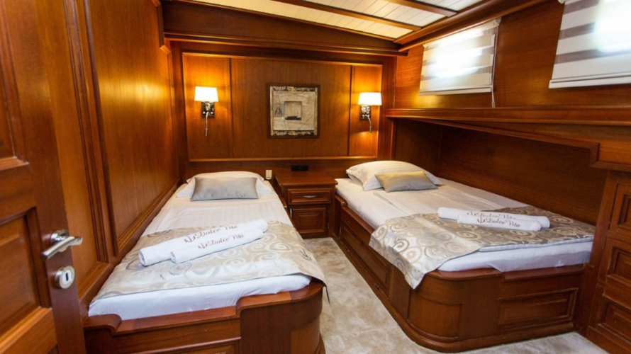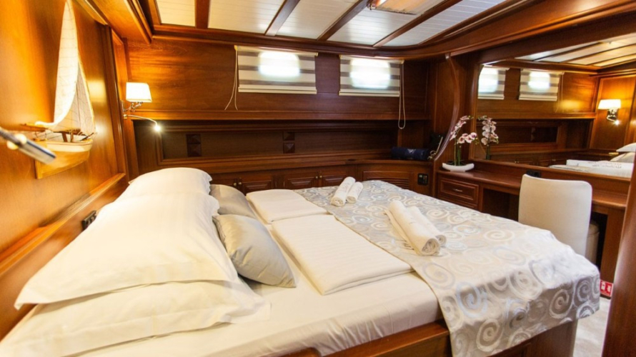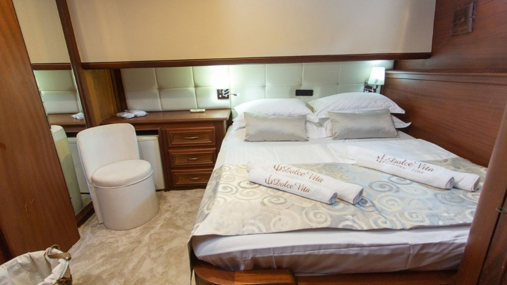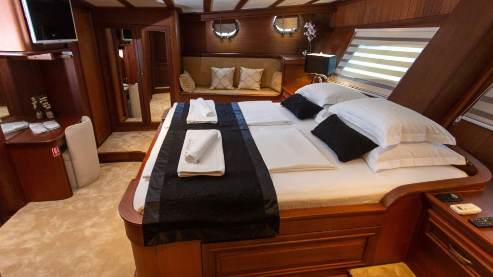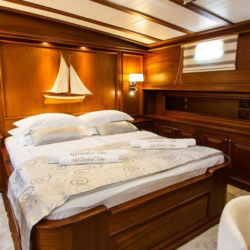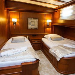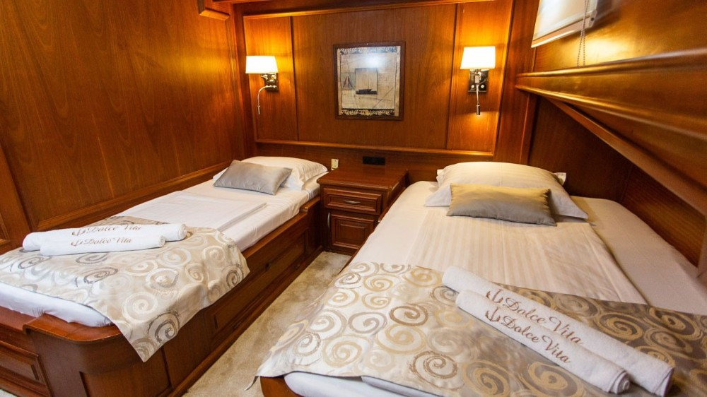 6 Kabin: 2 Master, 3 Double, 1 Twin kabin. Tüm kabinlerde klima, duşakabinli banyo, LCD TV/DVD, müzik sistemi, saç kurutma makinesi, banyo ve el havluları.