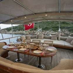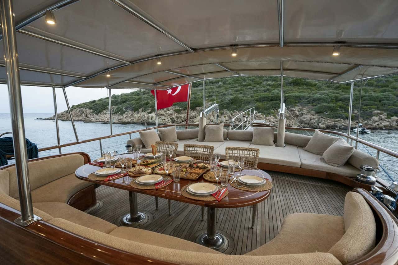 Siz hiç bir şeye karışmadan tatiliniz boyunca size tam pansiyon konaklama sunabiliriz. Bu durumda Standart, Lüks ya da Delüks menülerimizden birini tercih ederek kişi başı günlük 45 ile 65 Euro arasında değişen bir bedel ödeyerek alkollü içecekler hariç herşey dahil tatilinizi yapabilirsiniz. Alkollü içeceklerinizi dilediğiniz şekilde temin edip tekneye getirebilirsiniz.