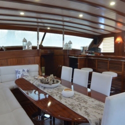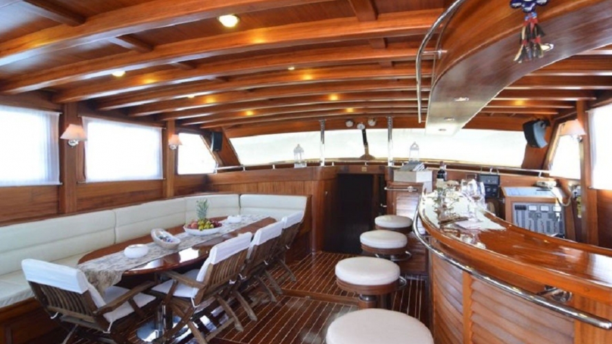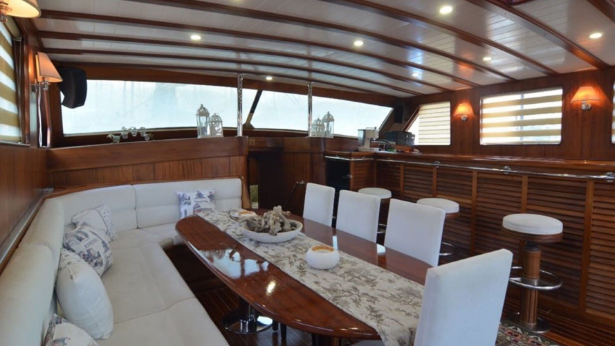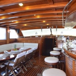Smyrna Gulet, Tam donanımlı ayrı bir mutfak, açık ve kapalı yemek bölümü ile klimalı bir salonu bulunmaktadır. Salonda TV,DVD, müzik sistemi bulunmaktadır.Tam donanımlı ayrı bir mutfak, açık ve kapalı yemek bölümü ile klimalı bir salonu bulunmaktadır. Salonda TV,DVD, müzik sistemi bulunmaktadır. Ayrıca güvertede geniş bir alanda yeterli güneşlenme minderleri mevucttur.